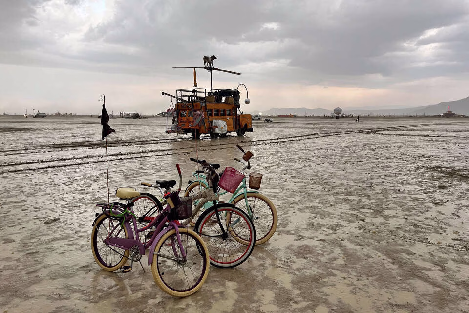 The trouble for Burning Man 2025 started before most people even arrived. Violent dust storms with 50 mph winds ripped through the desert, crushing camps and destroying art installations. Then came the thunderstorms and heavy rain, turning the dry lakebed into a sea of mud and standing water, a grim repeat of the 2023 “mudpocalypse”. The gates were repeatedly shut down, leaving thousands stranded for hours.